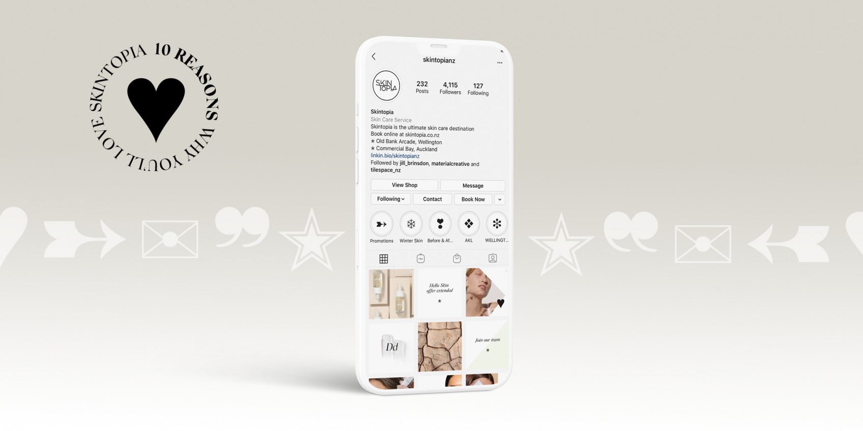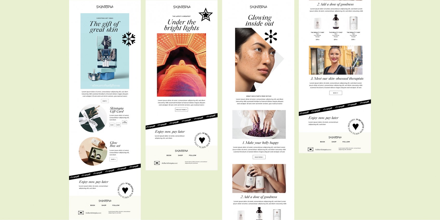 A beautiful little project to refine and polish the design identity for a single skincare clinic before number two opened in Commercial Bay. While the logo was already in play, the brand needed a suite of new design assets to properly tell its story. We brought it alive with fresh typography, colour, iconography, photography and a vibrant tone of voice across all channels.